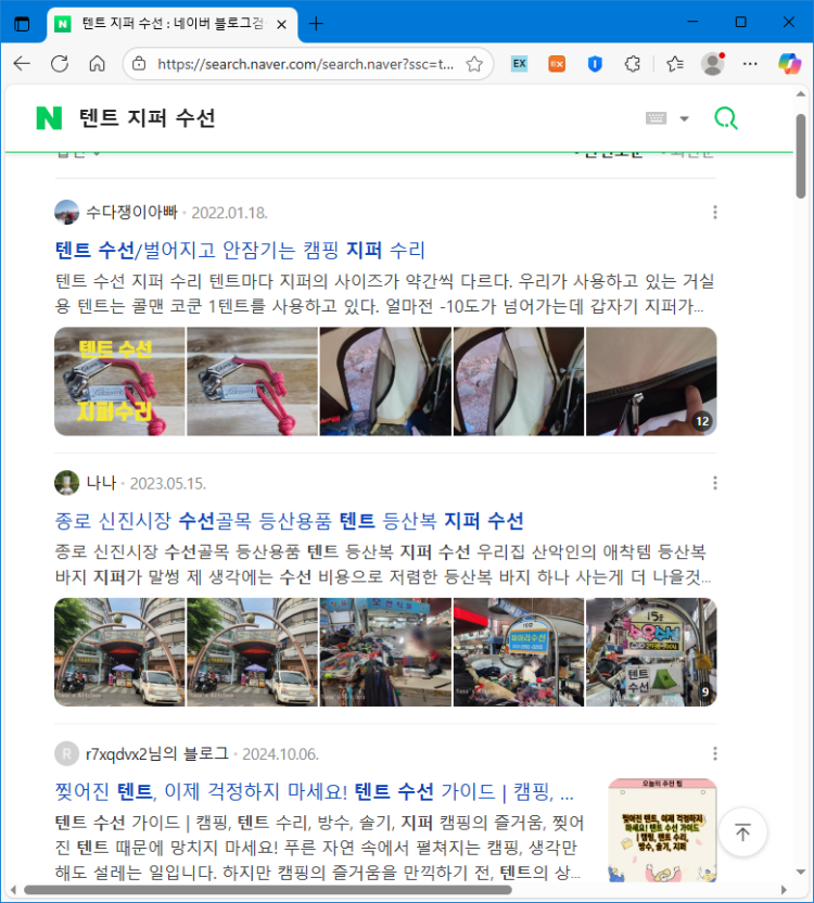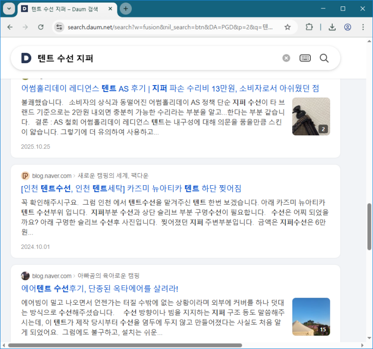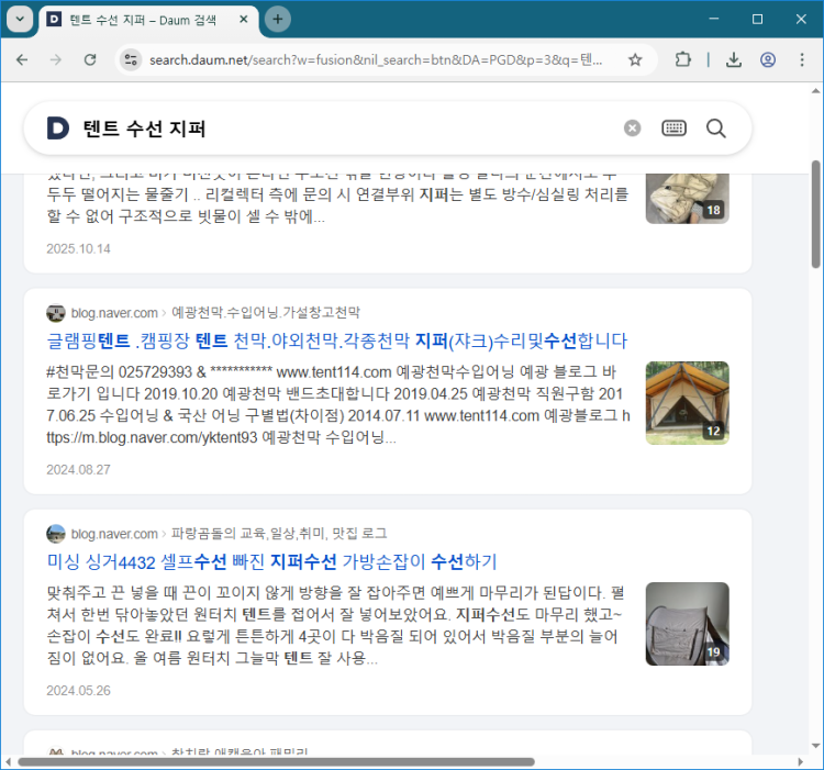 예를 들어서 - 텐트 수선 지퍼 -라고 다음이나 네이버에서 검색을 해보면