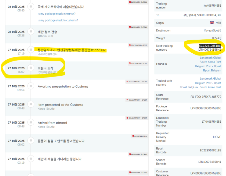 님 택배는 통관이 안되 아직 한국세관( 국제우편물센터)에 있는 것으로 추정됩니다. 우체국에서 님에게 이미 추정 관세부과를 통지했다고 생각되는데..... 님 택배가 인천 국제우편물센터에 도착한 것은 10월 27일 이고 이후 통관이 안된 상태로 아마 발송자에게도 연락이 갔을 것으로 생각합니다.