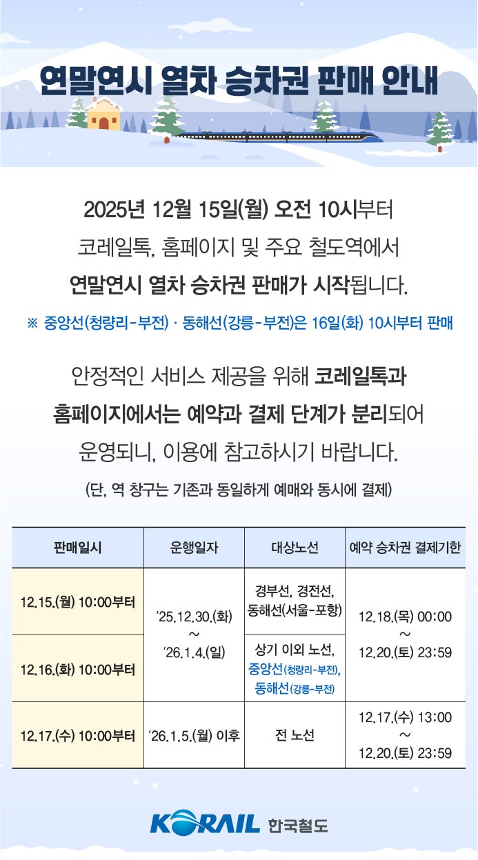 안녕하세요 질문자님 경부선 , 경전선 , 동해선(서울 ~ 포항)구간만 오늘 예매시작이고 12월16일(화) 10시부터는 전노선(전국) 예매가 가능합니다