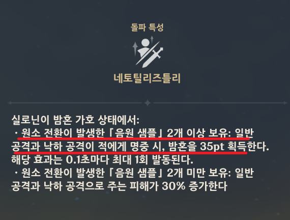 실로닌 원소스킬 쓰면 위 스샷처럼 밤혼 상태로 진입합니다 이때는 밤혼 게이지는 45pt 입니다