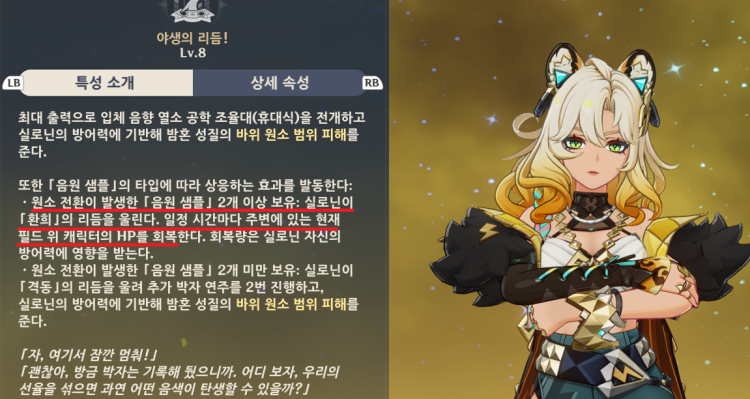 이게 실로닌의 능력이고 단순히 실로닌 하나만 있을 뿐인데 다른 딜러 캐릭터들의 딜량 상승이 눈에 보일 정도로 차이가 나니까 사실상 원신내 캐릭터 중에서도 개사기에 가까운 서포터 능력을 지녔다고