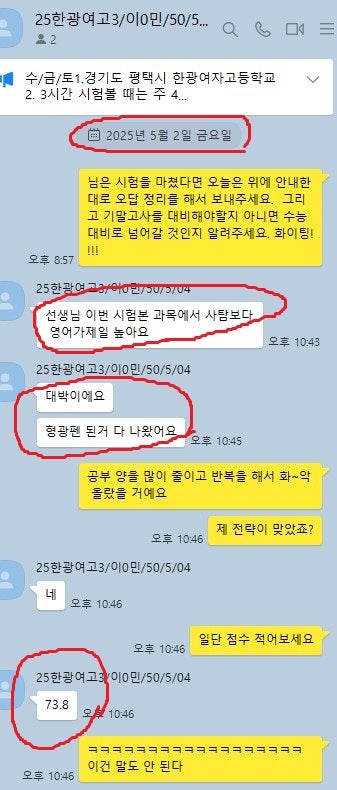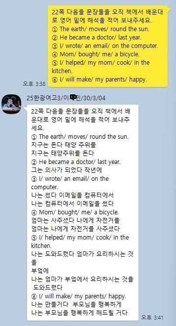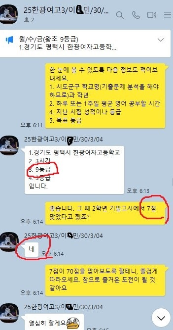 어떻게 공부하는지 카톡 공부 내용을 충분히 첨부할 테니 꼼꼼히 읽어보세요. 중.고생 후기는 카테고리 1번의 (8/9)번에 모두 들어 있고 7~9등급들의 후기는 (6)번에 들어있습니다.