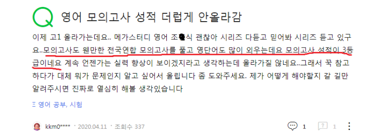 질문자 같은 학습자들 이곳에 <<학원 수강료로>> 편안한 요일과 편안한 시간에 1:1로 24시간 배울 수 있고, 24시간 자유롭게 질문하고 보이스톡으로 피드백 하면서, 7~9등급들도 단기간에 1등급을 달성하게 해드리는 입시 전문가(유니크 쏙쏙 영문법 저자)가의 족집게 튜터링(수준별 맞춤형 인강+1:1 원격 개인지도+24시간 피드백=학원 수강료) 이 있으니 수많은 성적표를 보시고 참고해보세요. 성적표 첨부합니다. 블로그에 1000명이 넘는 학생들의 후기와 성적표/합격증이 업로드 되어 있으니 직접 확인해보세요.