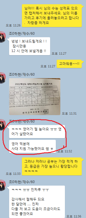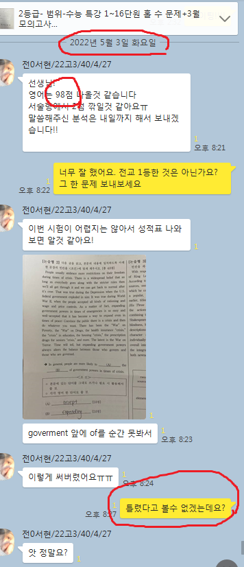 고3. 2등급 1달 수강하여 내신 1등(98점), 수능 1등급(성적표 확인 요망)